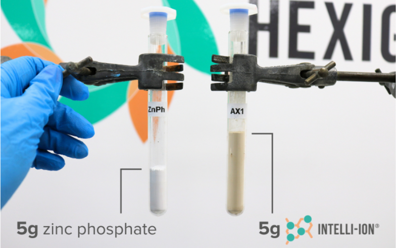 Whilst the cost per kilo of Intelli-ion® AX1 is higher than zinc phosphate, AX1’s low specific gravity (~1.35) delivers more usable volume per unit weight and effective protection at low loadings.